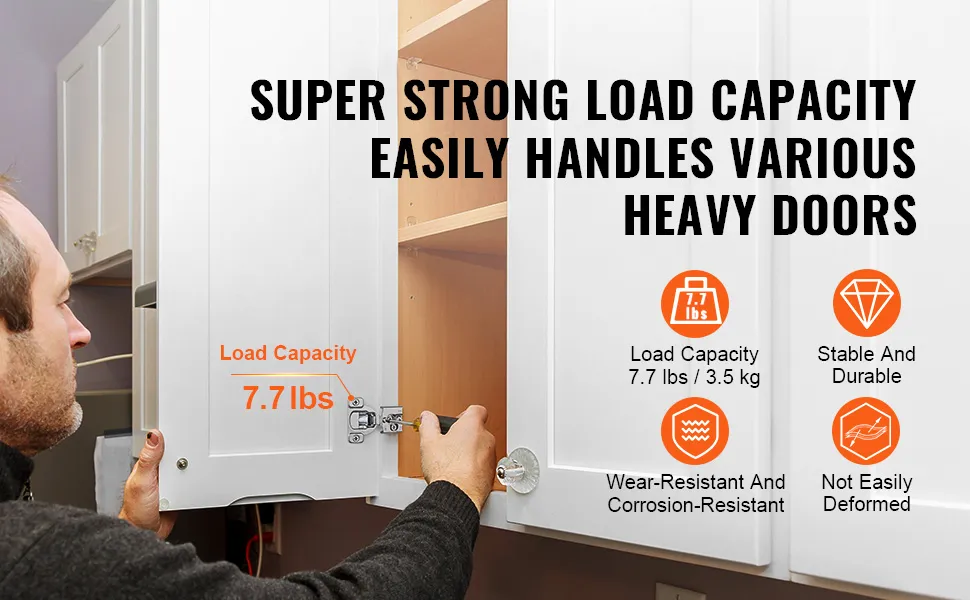 Ten zawias meblowy charakteryzuje się wysoką nośnością. Pojedynczy zawias z łatwością utrzyma ciężar drzwi do 3,4 kg. Nawet ciężkie drzwi meblowe będą pewnie podparte i niezawodne w użytkowaniu.
