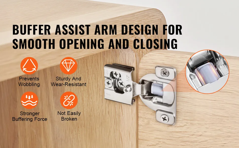 Nasze zawiasy meblowe pasują do wszystkich typów drzwi szafek. Wbudowany, cichy amortyzator skutecznie redukuje hałas podczas zamykania drzwi i chroni szafkę przed uderzeniami.