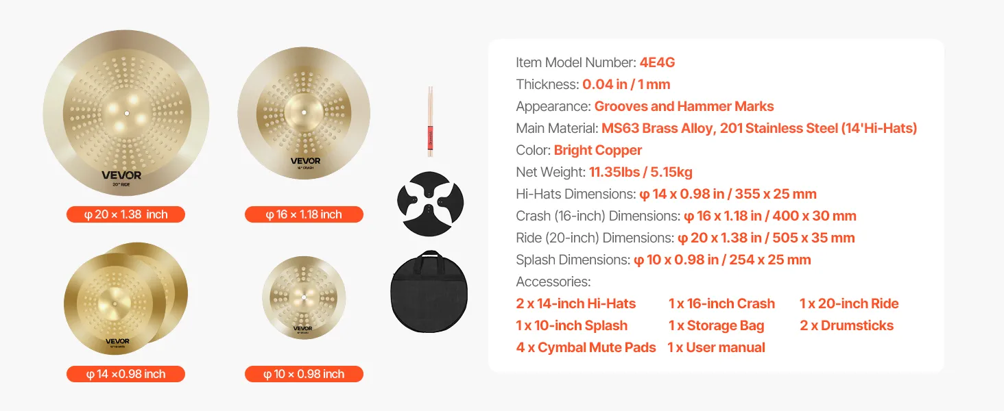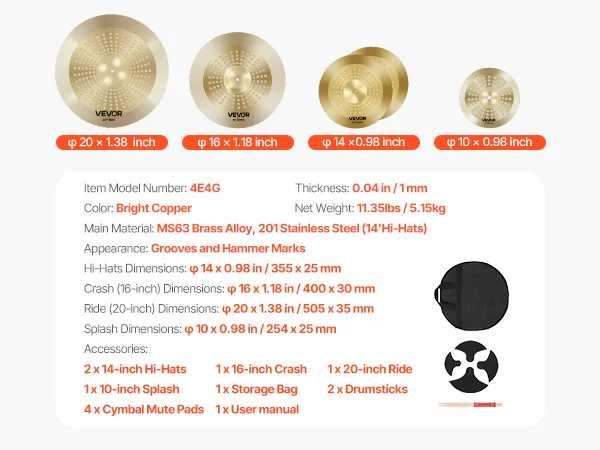 Ten zestaw talerzy perkusyjnych składa się z czterech talerzy: splash 254 mm, hi-hat 355 mm, crash 400 mm i ride 505 mm. W zestawie znajdują się również dwie pałeczki, pokrowiec i cztery ciche pady. Jego czyste brzmienie i wszechstronność sprawiają, że jest idealny dla początkujących perkusistów!