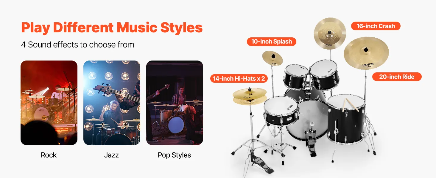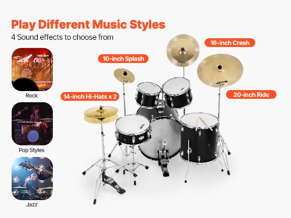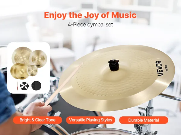 Nasz pakiet talerzy oferuje cztery unikalne brzmienia: hi-hat, crash, ride i splash. Każdy talerz nadaje nowy wymiar Twojej muzyce, niezależnie od tego, czy grasz rocka, jazz czy pop – idealne dla każdego perkusisty!
