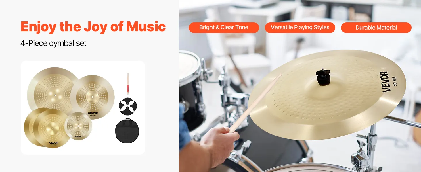 Wieloczęściowy zestaw talerzy: Ten zestaw talerzy zawiera talerze splash o średnicy 254 mm, hi-hat o średnicy 355 mm, crash o średnicy 400 mm i ride o średnicy 505 mm, oferując wszechstronne brzmienie dla każdego gatunku muzycznego. Idealny do jazzu, rocka i popu – pasuje do każdego stylu.