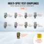 9 test couplings with plastic protection: Includes 9 test couplings, such as G1/8, G1/4, G3/8, M10/1, M10/1.25, M14/1.5, UNF7/16-20, UNF9/16-18, and quick connectors. This excavator pressure gauge set can be used with various excavator models. The threaded connections are covered with a protective plastic film to prevent damage and ensure secure connections.