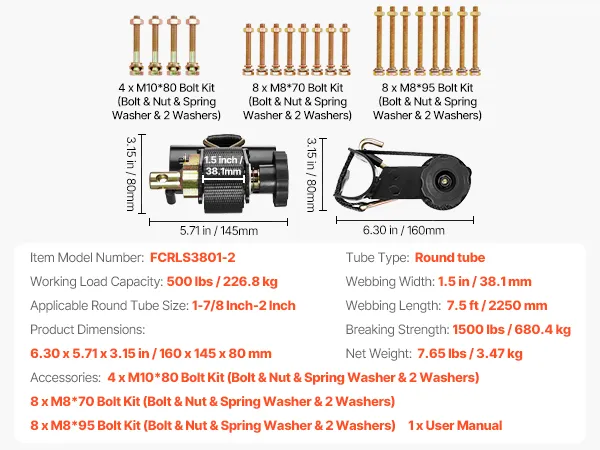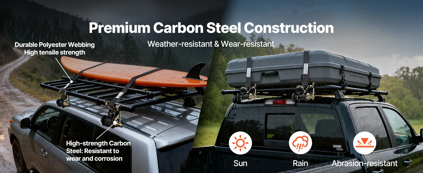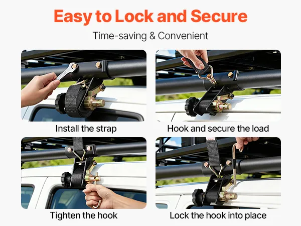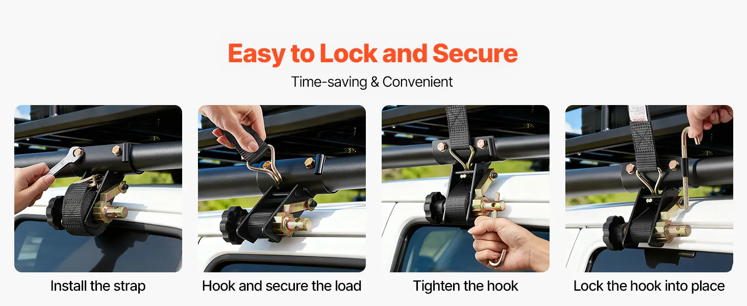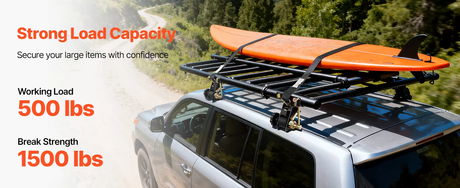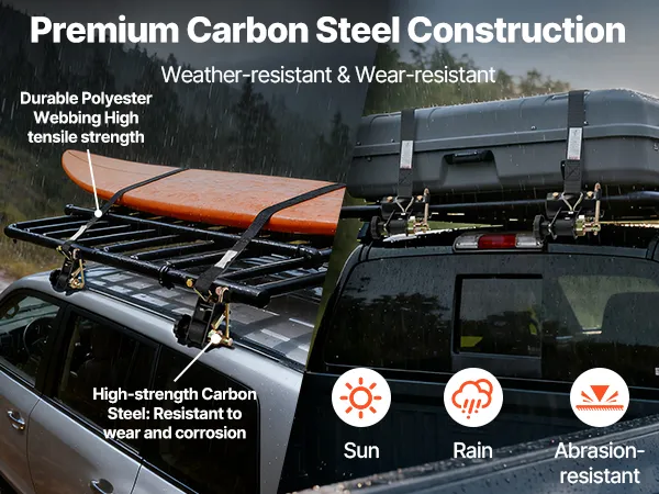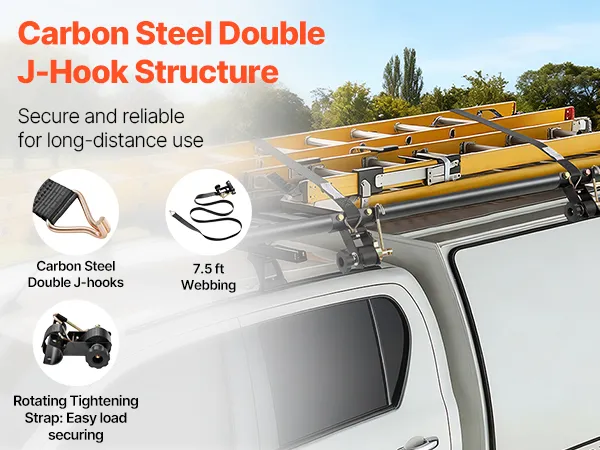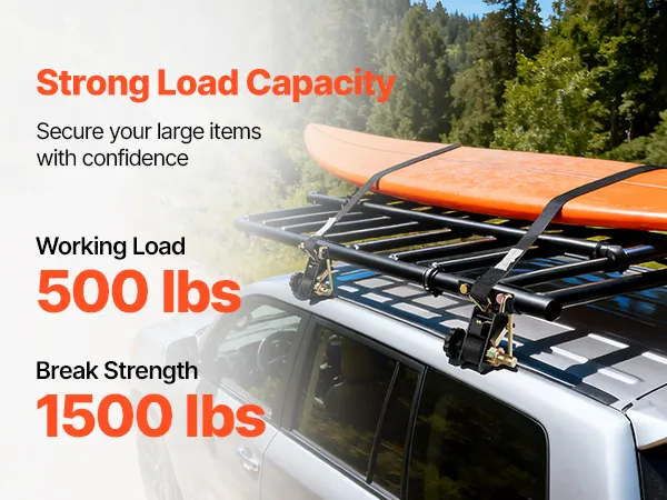 Te pasy zapadkowe do bagażników dachowych są zaprojektowane do obciążenia roboczego 226,8 kg i obciążenia zrywającego 680,4 kg. Pomagają bezpiecznie zamocować długie drabiny lub ciężki sprzęt do bagażnika dachowego, zapewniając stabilniejszy transport na autostradzie.