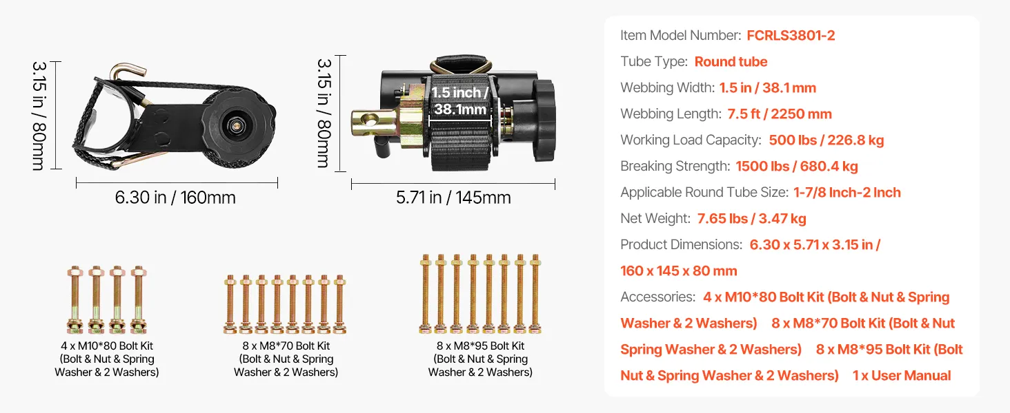 Pasy napinające do ram drabinowych VEVOR, 47,5–50,8 mm, montaż na czarnej okrągłej rurze, 38 mm x 2,25 m, pasy zapadkowe z podwójnymi hakami J, nośność 226,8 kg, z zapięciem na klamrę (opakowanie 2 szt.)