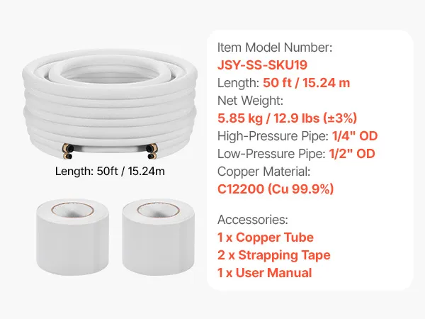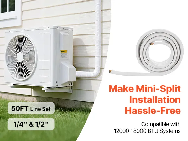 Ten zestaw jest kompatybilny z klimatyzatorami typu mini-split. Wysokiej jakości węże są odporne na zagięcia i szczelne po zgięciu – idealne do skomplikowanych instalacji, takich jak garaże czy warsztaty. W zestawie znajduje się taśma klejąca – gotowy do użycia od razu po wyjęciu z pudełka. Prosta instalacja wymaga jedynie podstawowych narzędzi do podłączenia jednostki wewnętrznej i zewnętrznej.