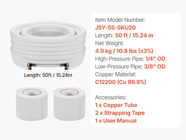 Przewód chłodniczy VEVOR 15,24 m, rura miedziana o średnicy zewnętrznej 6,4 i 9,5 mm, wężownica izolowana PE z nakrętkami kielichowymi, opaski zaciskowe, do klimatyzatora typu mini-split, systemu HVAC lub pompy ciepła