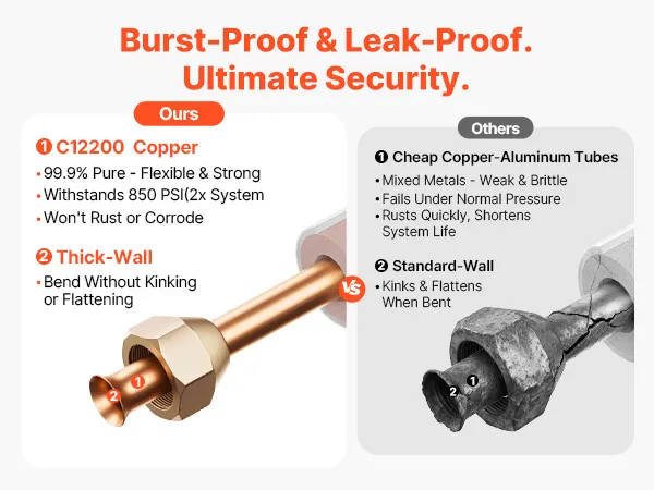 Rury miedziane najwyższej jakości: Wykonane z miedzi C12200 o czystości 99,9% i o grubych ściankach, co zapewnia odporną na zginanie i szczelną instalację zestawu rur typu mini-split, nawet w przypadku prowadzenia ich przez ściany.