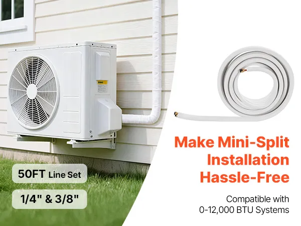 Ten zestaw jest kompatybilny z klimatyzatorami typu mini-split. Wysokiej jakości węże są odporne na zagięcia i szczelne po zgięciu – idealne do skomplikowanych instalacji, takich jak garaże czy warsztaty. W zestawie znajduje się taśma klejąca – gotowy do użycia od razu po wyjęciu z pudełka. Prosta instalacja wymaga jedynie podstawowych narzędzi do podłączenia jednostki wewnętrznej i zewnętrznej.