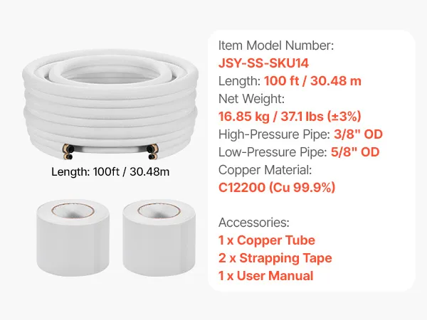 Rura miedziana do czynnika chłodniczego VEVOR o długości 30,48 m, średnica zewnętrzna rury miedzianej 9,5 i 15,9 mm, wężownica izolowana PE, opaski zaciskowe, do klimatyzatorów typu mini-split, systemów HVAC lub pomp ciepła