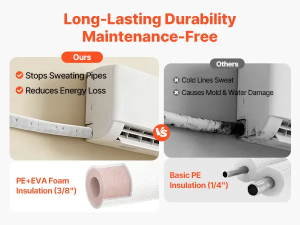 Izolacja energooszczędna: Kompozytowa izolacja PE+EVA o grubości 3/8" jest mocniejsza i bardziej odporna na warunki atmosferyczne niż standardowa izolacja, skutecznie redukując utratę ciepła i kondensację w zestawie instalacyjnym mini-split.