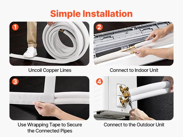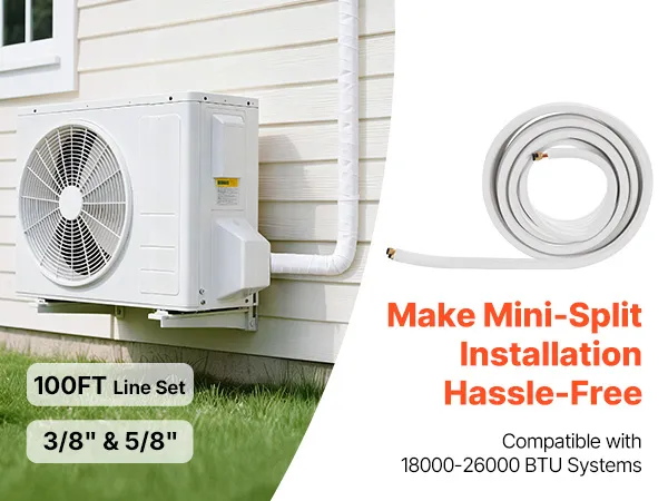 Ten zestaw jest kompatybilny z klimatyzatorami typu mini-split. Wysokiej jakości węże są odporne na zagięcia i szczelne po zgięciu – idealne do skomplikowanych instalacji, takich jak garaże czy warsztaty. W zestawie znajduje się taśma klejąca – gotowy do użycia od razu po wyjęciu z pudełka. Prosta instalacja wymaga jedynie podstawowych narzędzi do podłączenia jednostki wewnętrznej i zewnętrznej.