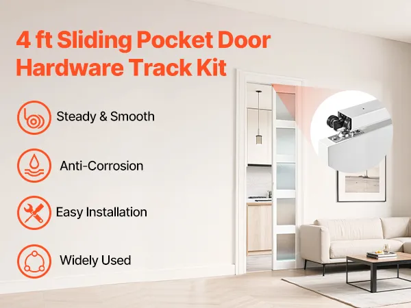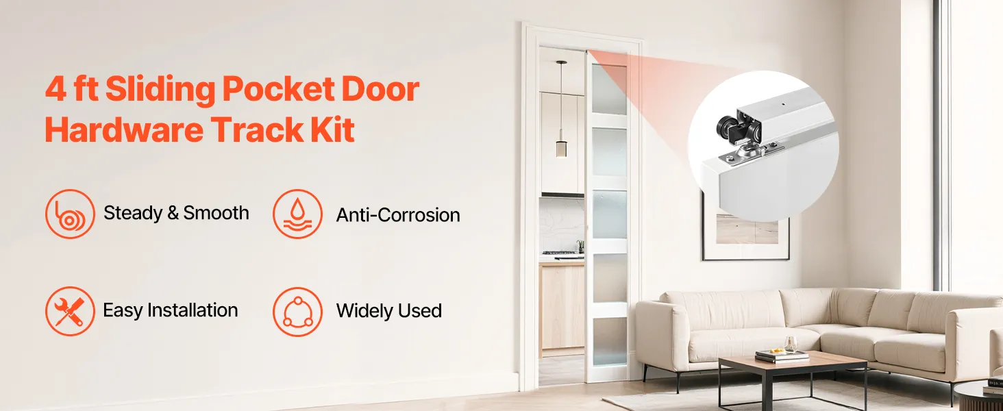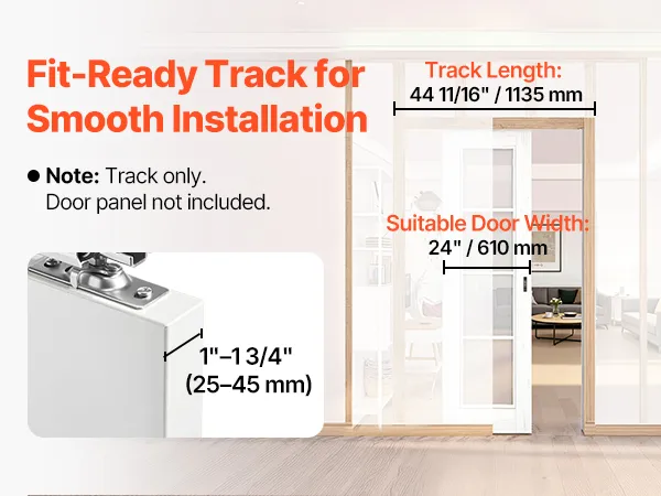 Zgodność z rozmiarem: Ten system drzwi przesuwnych pasuje do standardowych rozmiarów drzwi wewnętrznych. Dzięki prowadnicy o długości 1135 mm (44,69 cala) nadaje się do drzwi o szerokości 610 mm (24 cale) i grubości od 25 do 45 mm (1 do 1-3/4 cala). Idealny do sypialni, garderób i schowków.