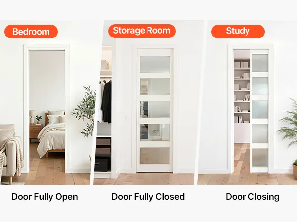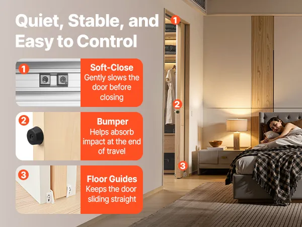 Płynne i ciche przesuwanie: Zestaw okuć do drzwi przesuwnych wyposażony jest w funkcję cichego zamykania, która delikatnie spowalnia drzwi przed zamknięciem, redukując uderzenia i hałas. Ukryte rolki z zawieszeniem trójkołowym zapewniają płynne przesuwanie i komfort użytkowania.