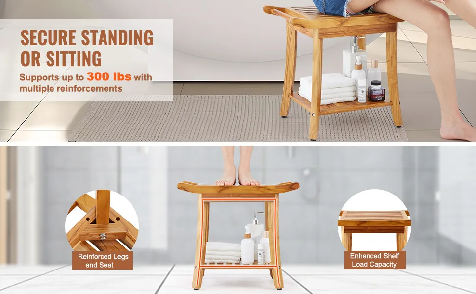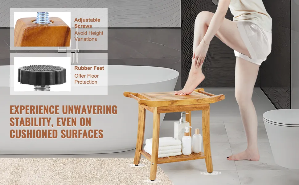 Nasza wodoodporna ławka prysznicowa z drewna tekowego jest bardziej stabilna niż bambusowa i dzięki dwuwarstwowej konstrukcji wytrzymuje obciążenie do 136 kg. Dzięki uchwytowi może służyć jako stolik boczny lub półka na buty i sprawdzi się zarówno w łazience, jak i salonie.