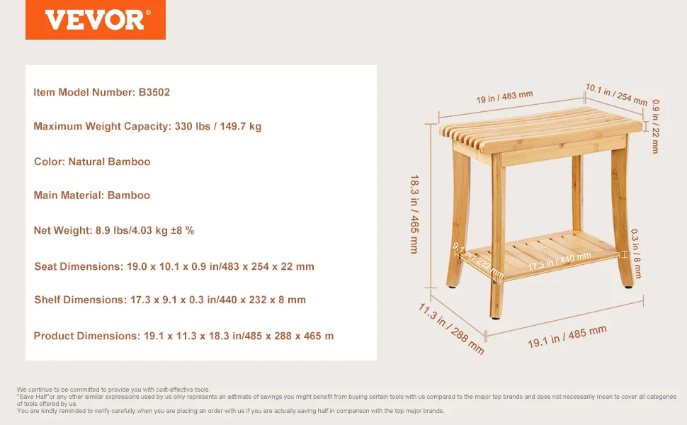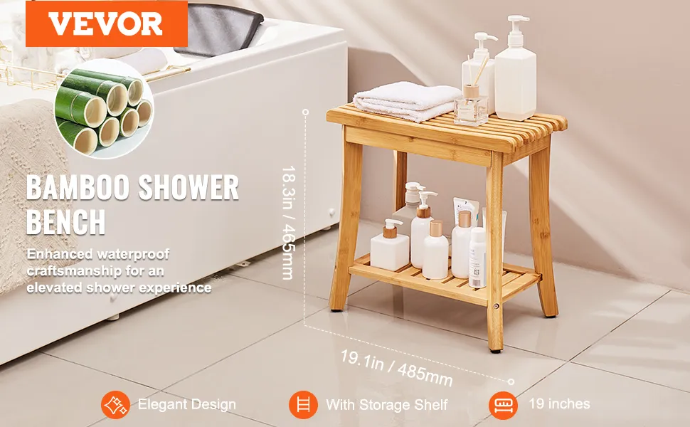 Ławka prysznicowa z bambusa VEVOR, 19,2 x 11,2 x 18,4 cala, wodoodporna, z uchwytem do przechowywania, udźwig 330 funtów, organizer na siedzisko do wanny spa, dla dorosłych, seniorów, kobiet, osób starszych, do użytku wewnątrz i na zewnątrz