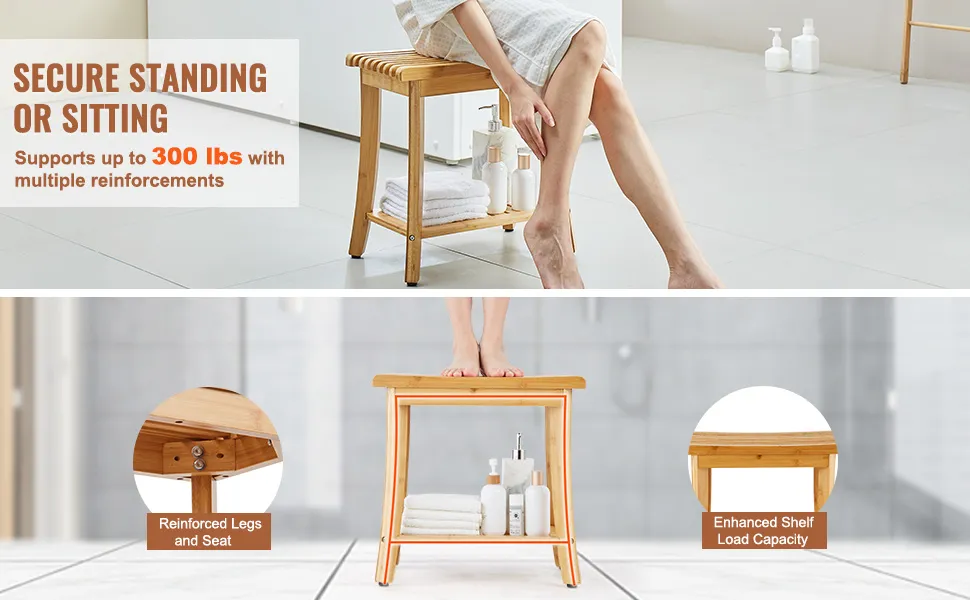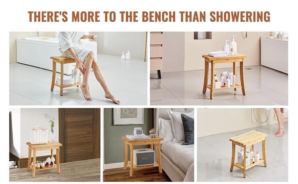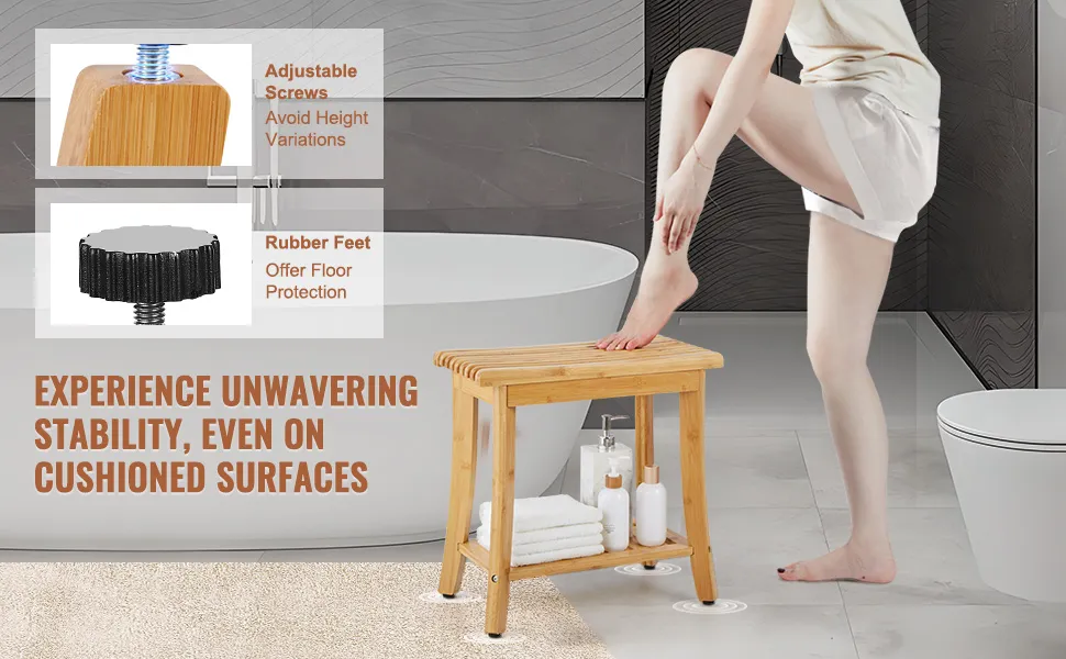 Nasza wodoodporna bambusowa ławka prysznicowa jest właśnie dla Ciebie. Dzięki solidnej, dwuwarstwowej konstrukcji wytrzymuje obciążenie do 150 kg. Może służyć jako stolik kawowy lub półka na buty i idealnie pasuje do łazienki, salonu i sypialni.