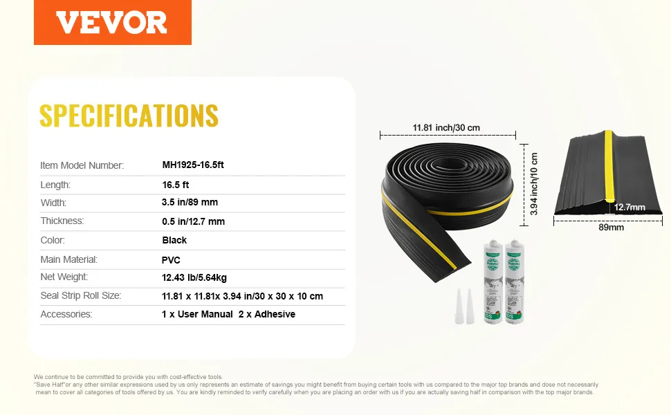 VEVOR Uszczelka progowa do drzwi garażowych 5,03 m Uszczelka dolna do drzwi garażowych z klejem, odporna na warunki atmosferyczne, do dolnej części drzwi garażowych, ulepszona, gruba warstwa PVC