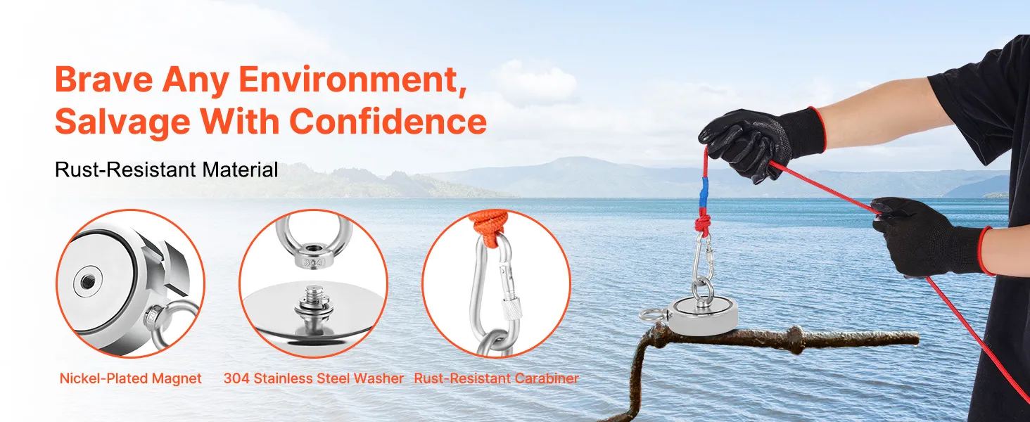 Both the fishing magnet and the accessories are made of stainless steel or have rust-resistant coatings. They are waterproof, abrasion-resistant, and effectively prevent wear, ensuring a longer lifespan.