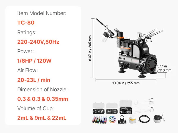 Cicha praca: Zestaw aerografu z kompresorem pracuje cicho nawet podczas długotrwałego użytkowania, pozwalając w pełni skupić się na swojej pracy. Niezależnie od tego, czy jesteś w studiu, czy w domu, ciesz się spokojnym i kreatywnym otoczeniem, w którym Twoje pomysły mogą swobodnie płynąć.