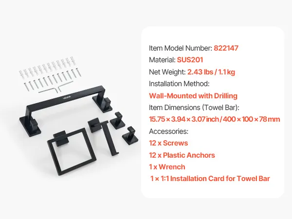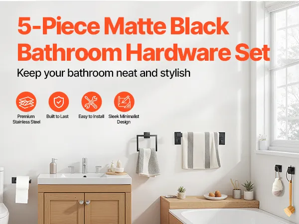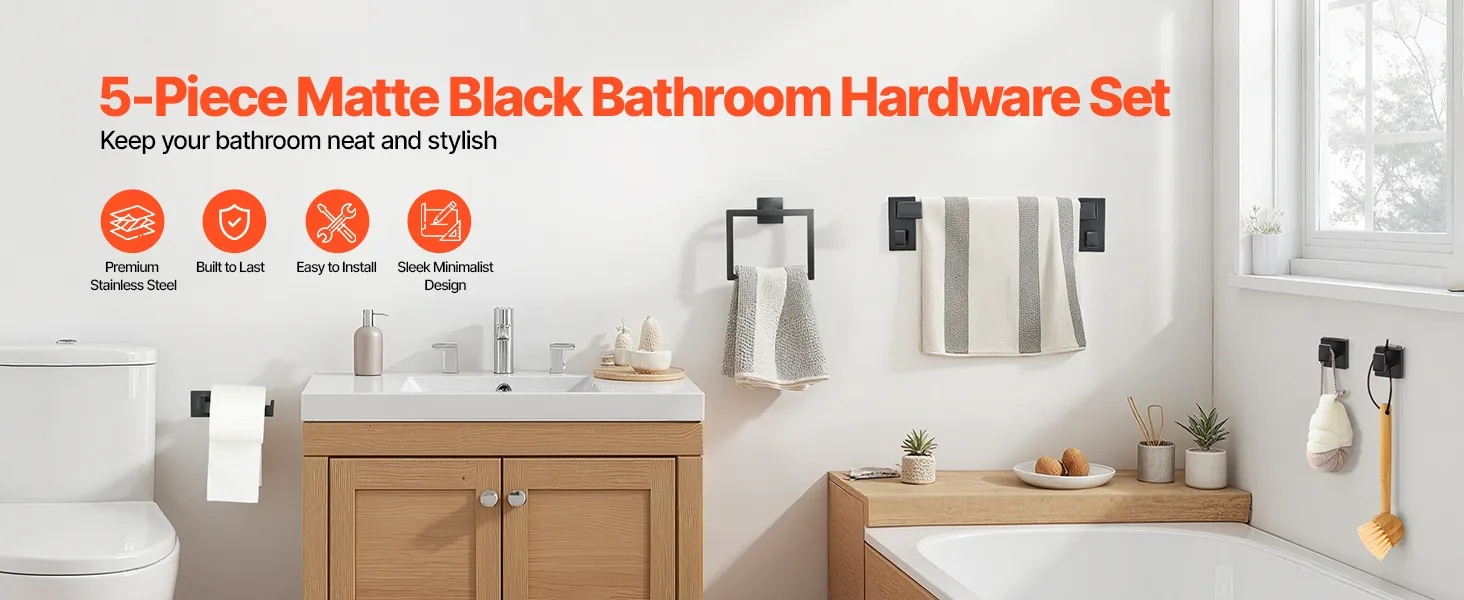 Zestaw akcesoriów łazienkowych VEVOR (5 elementów) zawierający drążek na ręczniki (406,4 mm) i uchwyt na ręczniki (kwadratowy pierścień) oraz 2 haczyki i uchwyt na papier toaletowy, do łazienki, do montażu na ścianie, matowa czerń