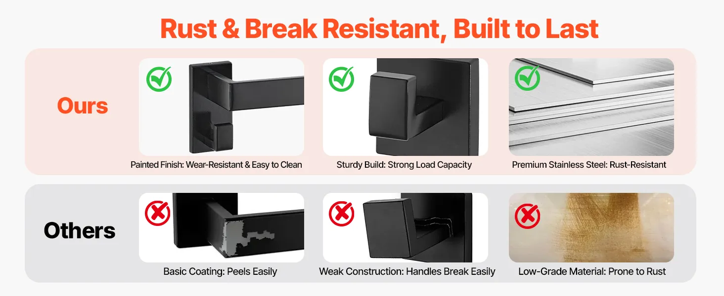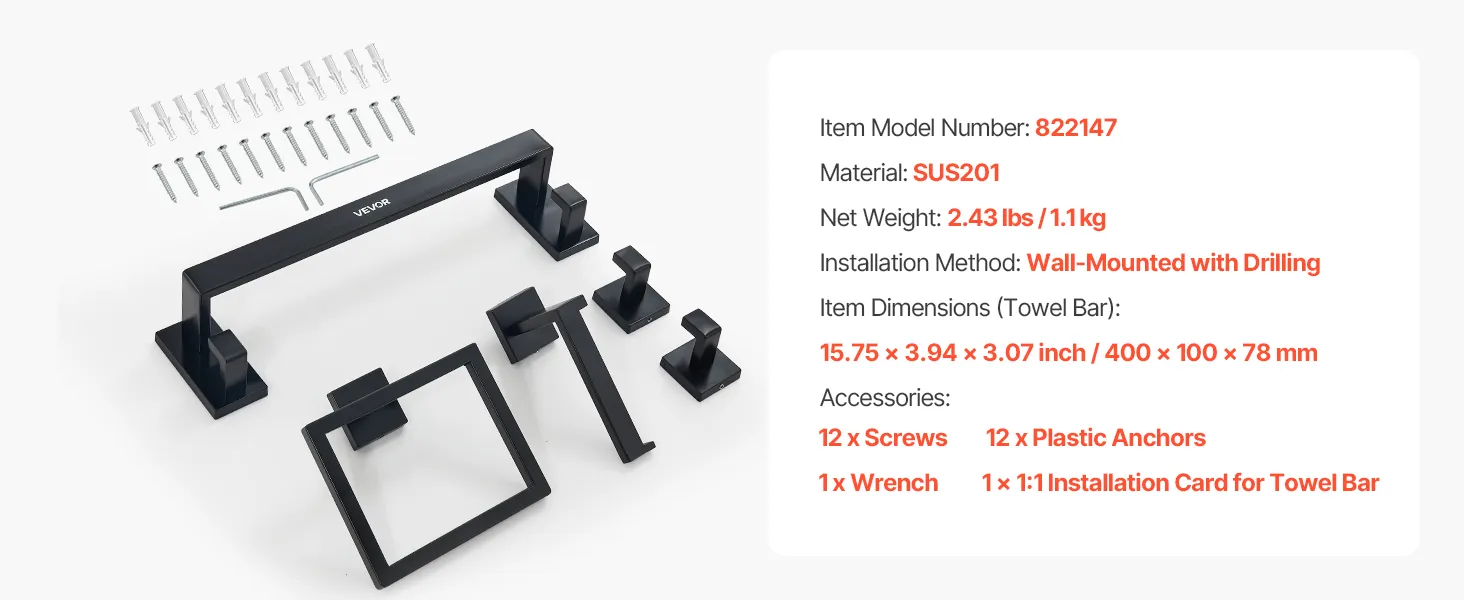 Wysokiej jakości materiały: Ten matowo-czarny zestaw łazienkowy wykonany jest z wysokiej jakości stali nierdzewnej i jest wodoodporny, odporny na rdzę i korozję, co zapewnia długą żywotność. Solidna metalowa konstrukcja gwarantuje lata niezawodnego użytkowania, a montaż na ścianie zapewnia większą stabilność i nośność.