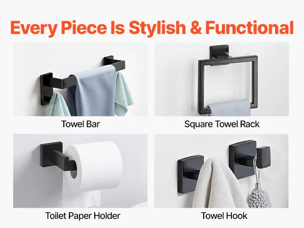 Wszechstronny zestaw: Ten 5-elementowy zestaw łazienkowy zawiera drążek na ręczniki o długości 40 cm (15,75 cala) z haczykami, uchwyt na ręczniki, uchwyt na papier toaletowy i dwa wieszaki na szlafroki. Ta przemyślana kombinacja zaspokoi wszystkie Twoje potrzeby w zakresie przechowywania rzeczy w łazience, nie pozostawiając żadnego niewykorzystanego elementu. Uchwyt na ręczniki posiada dwa dodatkowe haczyki, co zapewnia dodatkową przestrzeń do przechowywania, czyniąc go jeszcze bardziej praktycznym.