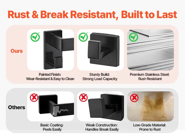 Nasz zestaw wieszaków na ręczniki wykonany jest z wysokiej jakości stali nierdzewnej, odpornej na zużycie, zarysowania i rdzę — idealnej do wilgotnych łazienek i trwałej konstrukcji.