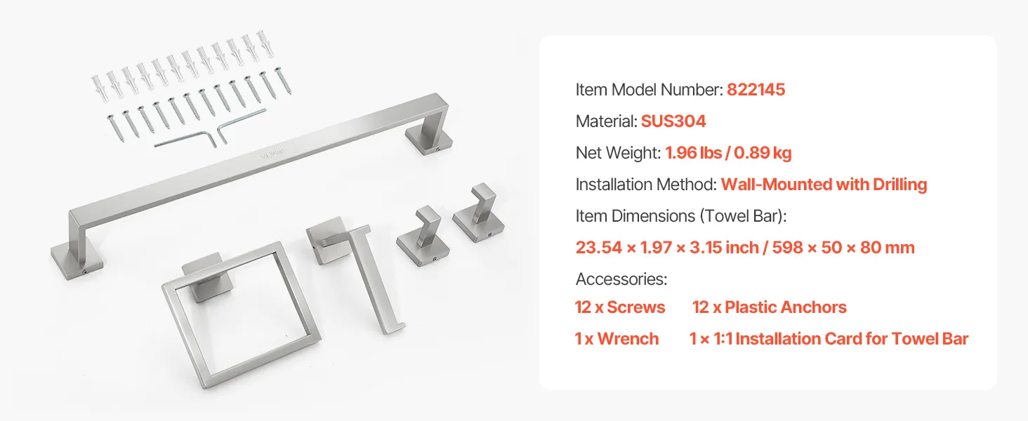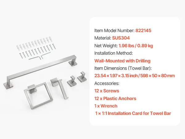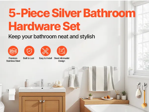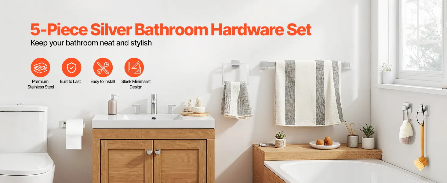 Zestaw akcesoriów łazienkowych VEVOR wykonany ze stali nierdzewnej 304 (5 elementów) zawierający drążek na ręczniki i uchwyt na ręczniki (kwadratowy pierścień) oraz 2 haczyki i uchwyt na papier toaletowy, do łazienki, montowany na ścianie w kolorze srebrnym