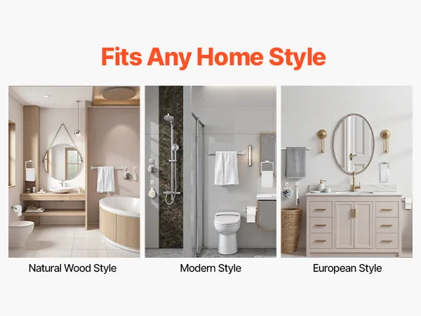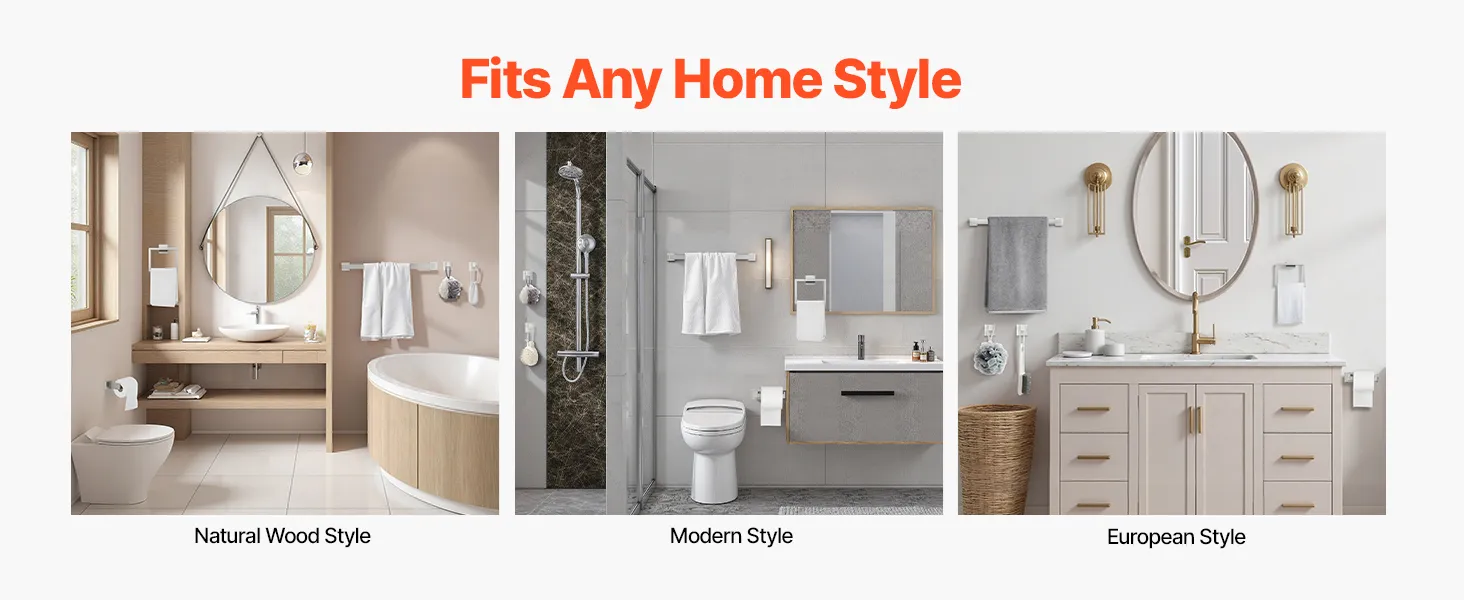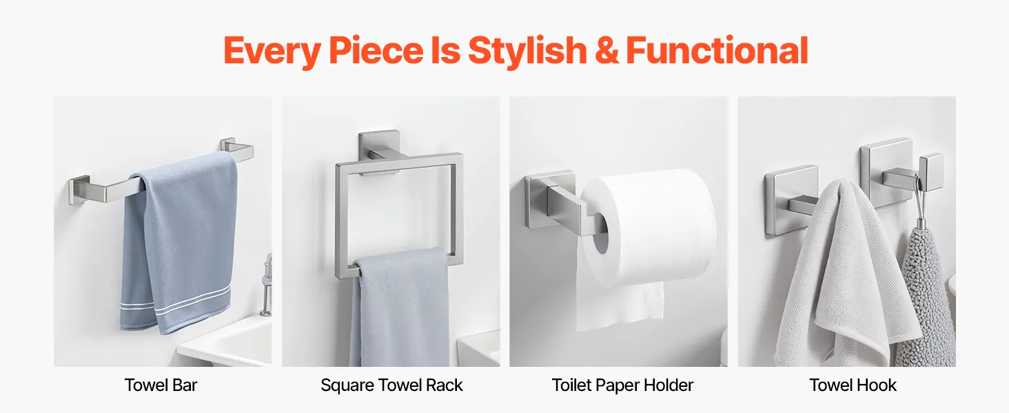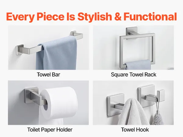 Wszechstronny zestaw: Ten 5-częściowy zestaw akcesoriów łazienkowych zawiera drążek na ręczniki o długości 23,54 cala (598 mm), uchwyt na ręczniki, uchwyt na papier toaletowy i dwa wieszaki na szlafroki. Przemyślana kombinacja spełni wszystkie Twoje potrzeby w zakresie przechowywania w łazience, nie pozostawiając żadnego niewykorzystanego elementu.