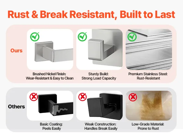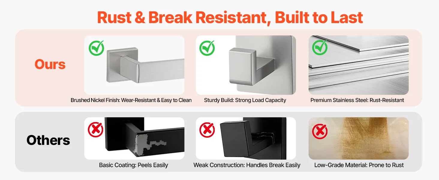 Wysokiej jakości materiały: Ten zestaw akcesoriów łazienkowych w kolorze szczotkowanego niklu został wykonany z najwyższej jakości stali nierdzewnej 304, która oferuje doskonałą wodoodporność, odporność na rdzę i korozję, gwarantując długotrwałą trwałość. Solidna metalowa konstrukcja gwarantuje lata niezawodnej pracy, a montaż na ścianie zapewnia większą stabilność i nośność.