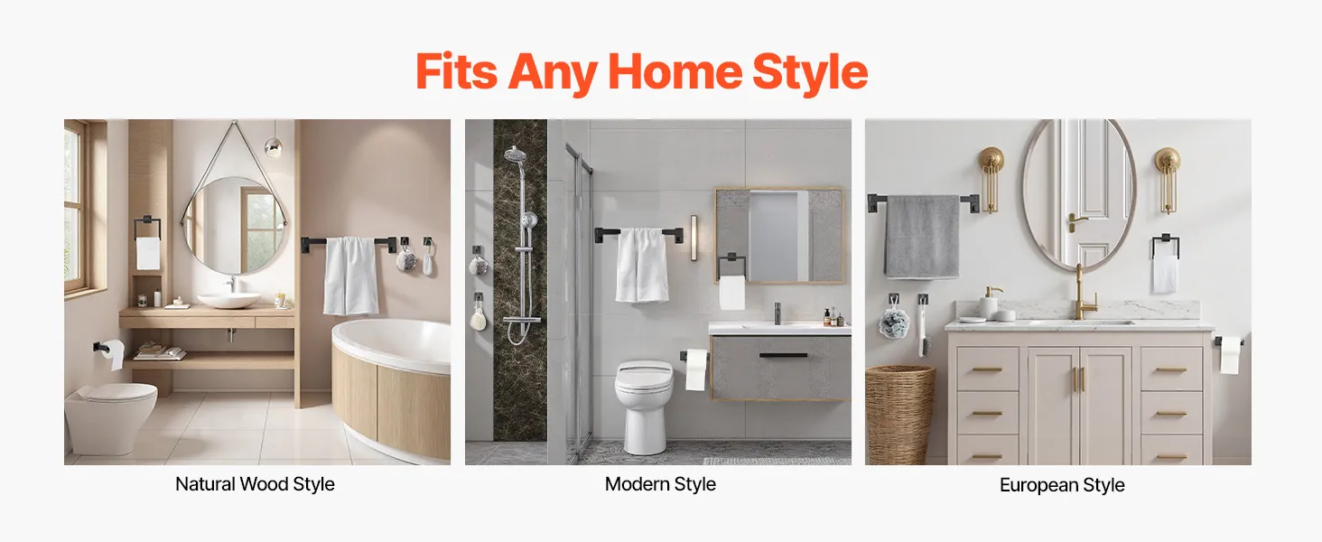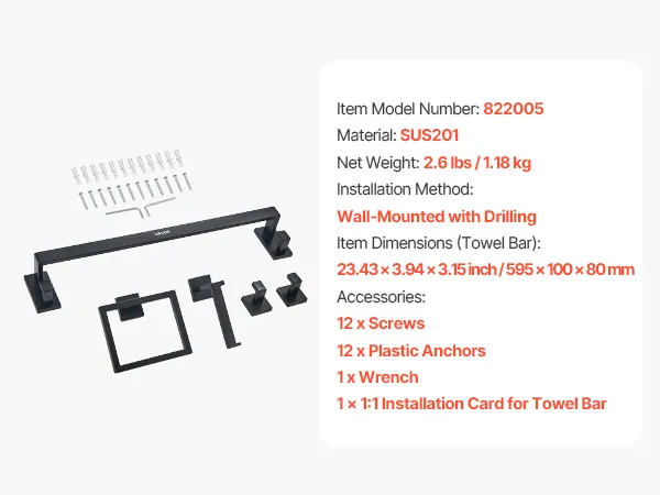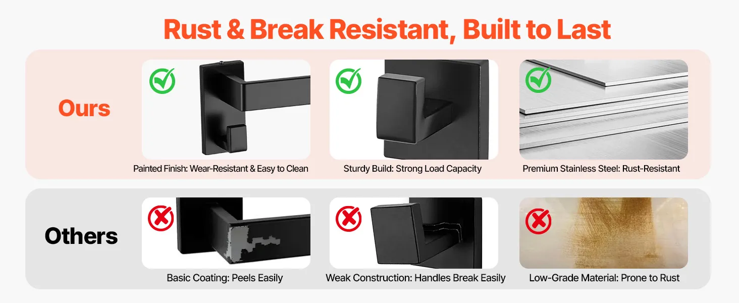 Wysokiej jakości materiały: Ten matowo-czarny zestaw łazienkowy wykonany jest z wysokiej jakości stali nierdzewnej i jest wodoodporny, odporny na rdzę i korozję, co zapewnia długą żywotność. Solidna metalowa konstrukcja gwarantuje lata niezawodnego użytkowania, a montaż na ścianie zapewnia większą stabilność i nośność.