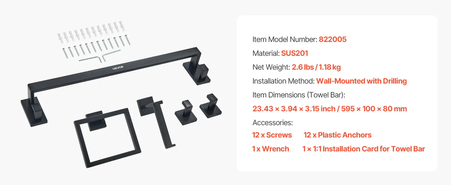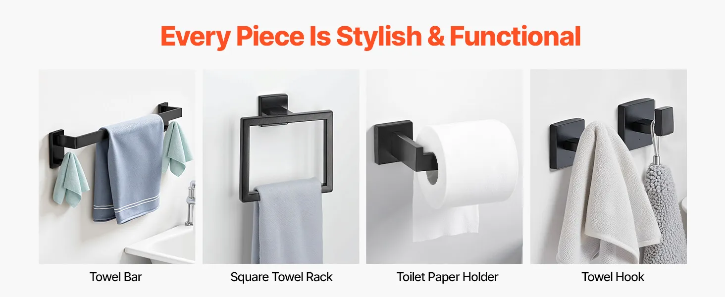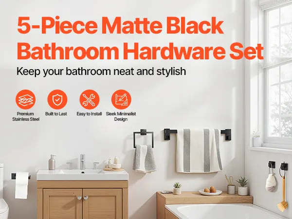 Zestaw akcesoriów łazienkowych VEVOR ze stali nierdzewnej (5 elementów) zawierający drążek na ręczniki i uchwyt na ręczniki (kwadratowy pierścień) oraz 2 haczyki i uchwyt na papier toaletowy, do łazienki, do montażu na ścianie, w kolorze czarnym