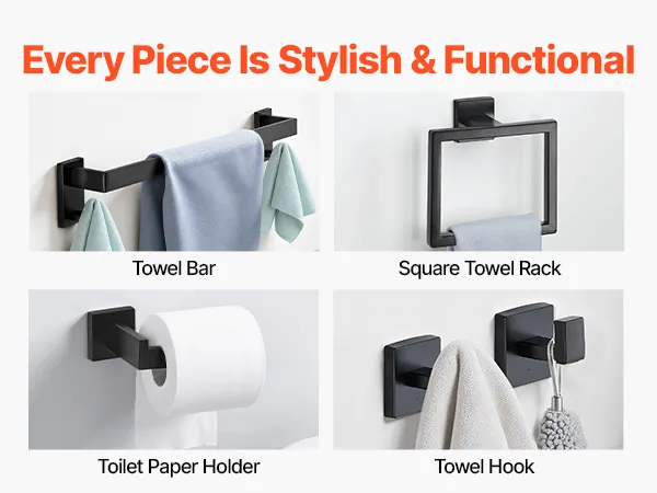 Wszechstronny zestaw: Ten 5-częściowy zestaw łazienkowy zawiera drążek na ręczniki o długości 23,43 cala (595 mm) z haczykami, reling na ręczniki, uchwyt na papier toaletowy i dwa wieszaki na szlafroki. Ta przemyślana kombinacja zaspokoi wszystkie Twoje potrzeby w zakresie przechowywania w łazience, nie pozostawiając żadnego niewykorzystanego elementu. Drążek na ręczniki posiada dwa dodatkowe haczyki, co zapewnia dodatkową przestrzeń do przechowywania, czyniąc go jeszcze bardziej praktycznym.