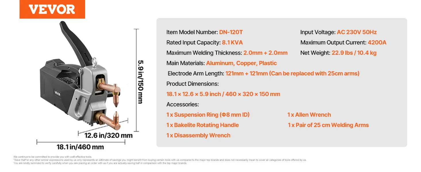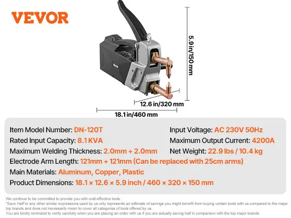 Przenośna zgrzewarka punktowa VEVOR, zgrzewarka punktowa do blach o grubości 4 mm, moc wejściowa 8,1 kVA, prąd elektryczny 4200 A, z ręcznym pistoletem spawalniczym