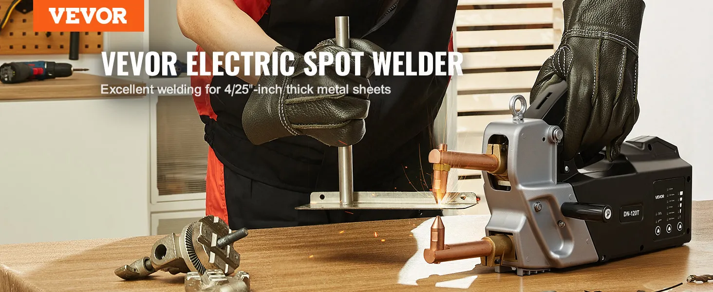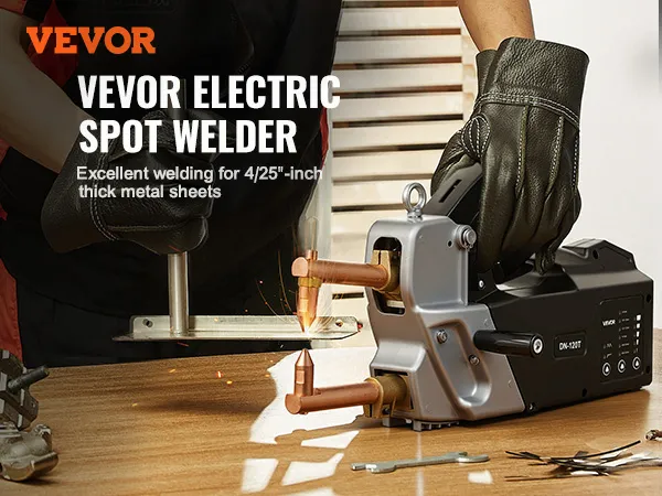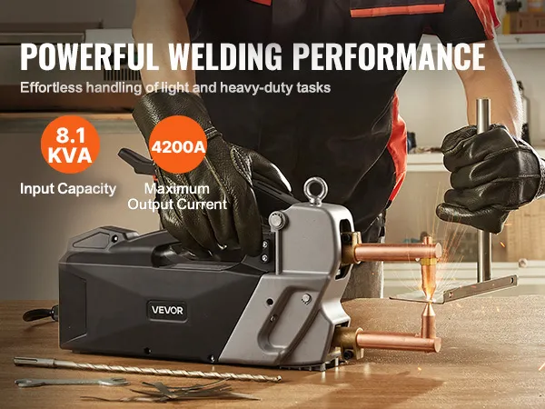 Przenośna zgrzewarka punktowa VEVOR efektywnie spawa blachy stalowe o grubości do 4 mm (np. ze stali węglowej). Dzięki mocy wejściowej 8,1 kVA i maksymalnemu prądowi wyjściowemu 4200 A zapewnia wydajne i wysokiej jakości rezultaty spawania. (Nie nadaje się do aluminium i stali nierdzewnej)