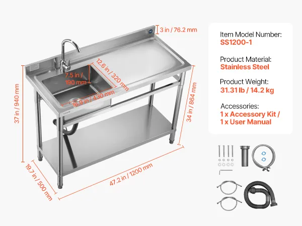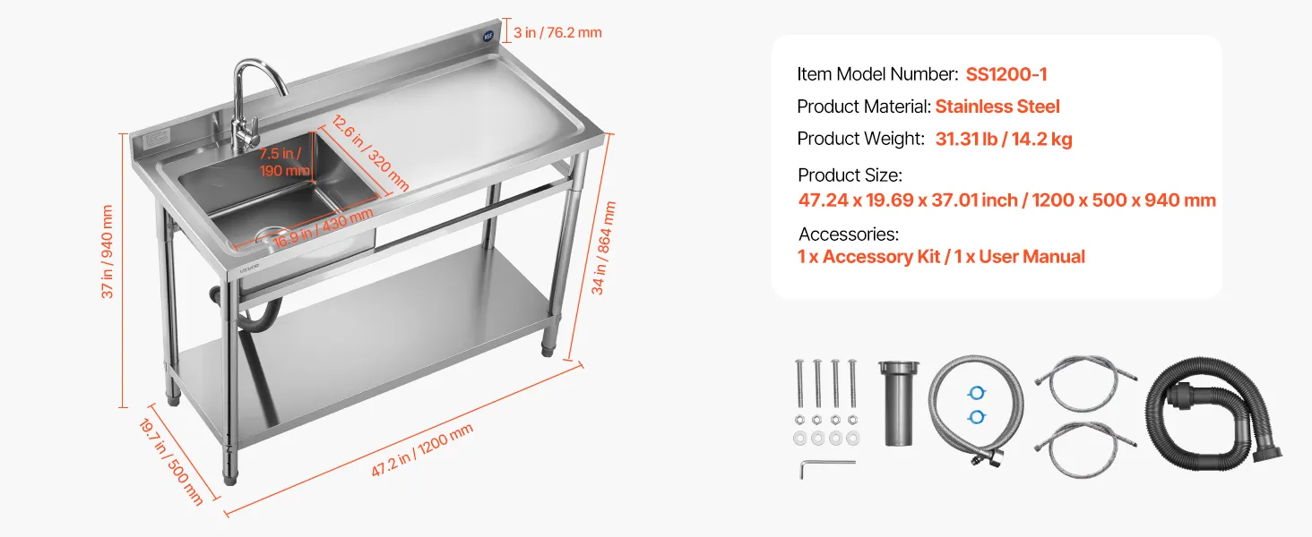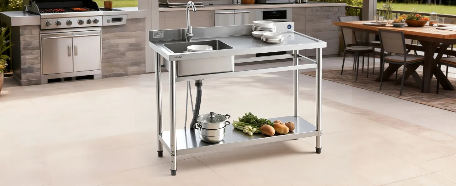 Zlewozmywak VEVOR ze stali nierdzewnej (120 x 50 x 94 cm), pojedyncza komora z baterią i półką, zlew kuchenny do garażu, restauracji, pralni, umywalka zewnętrzna z blatem (po prawej)