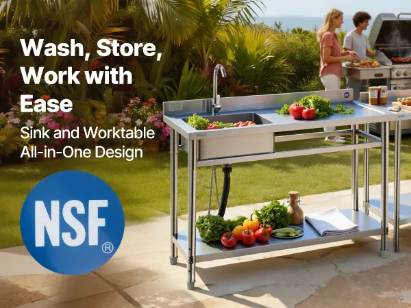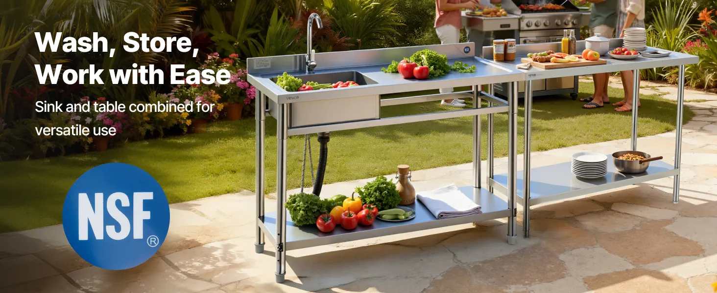 Wszechstronny i elastyczny w montażu: Idealny do kuchni zewnętrznych, tarasów, garaży, barów, restauracji i bufetów. Standardowy zlew ma regulowane nóżki, które zapewniają stabilność na nierównym podłożu.